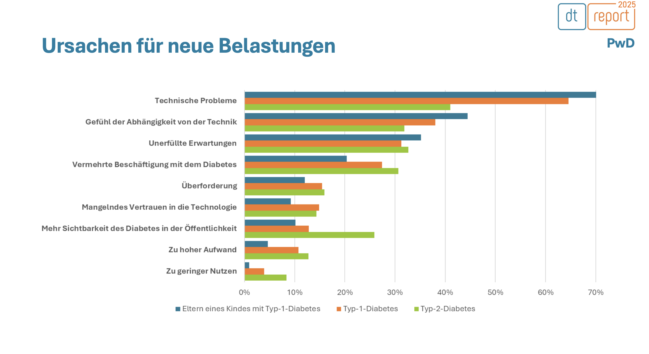 Diagramm 5: „Sicht von Betroffenen auf Diabetestechnologie: Reduktion vs Neue Belastungen“, Quelle: dt-report 2025.